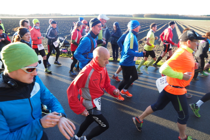 Etwa 10 Minuten vor dem Start füllte sich der Startbereich wieder und es ging im Gegensatz zu den überfüllten Stadtmarathons eher ruhig und gesittet zu. Viele der Läufer kannten sich, überall wurden noch gute Wünsche für das neue Jahr ausgesprochen und so liefen wir drei mit ungefähr 497 anderen nach dem Startschuss eher gemächlich in einem quatschenden Tross über die Startlinie.